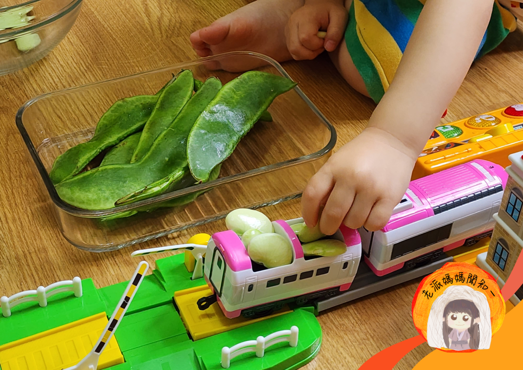 捏著豆莢扭一扭,扭出裂縫後,摳出皇帝豆。讓孩子把皇帝豆擺到火車、吉普車、恐龍車隊、扭蛋殼裡,可以變出無限玩法。